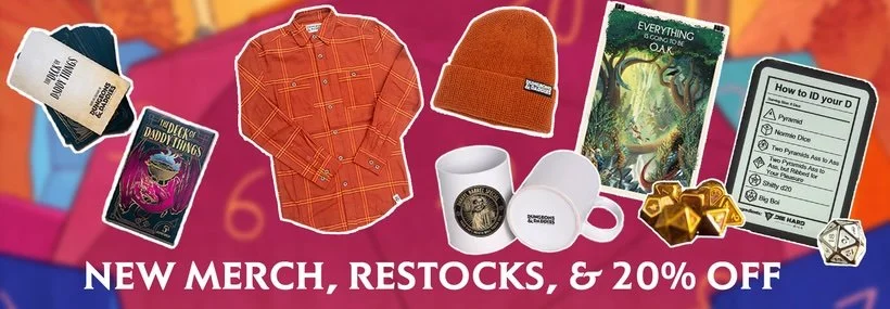 Our Black Friday sale continues until 11:59pm PST on Friday, 12/5, so be sure to head on over to our website for 20% off storewide (and to check out some fun new merch!) - store.dungeonsanddaddies.com